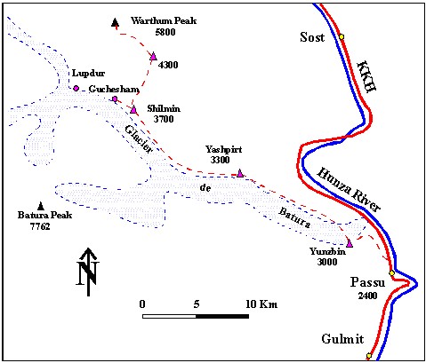 Le glacier de Batura est l’un des six grands fleuves de glace du massif du Karakorum. Il est moins connu que le glacier de Baltoro qui mène aux grands sommets (K2, Hidden Peak, Gashebrum) mais sa longueur de 56 Km est comparable.