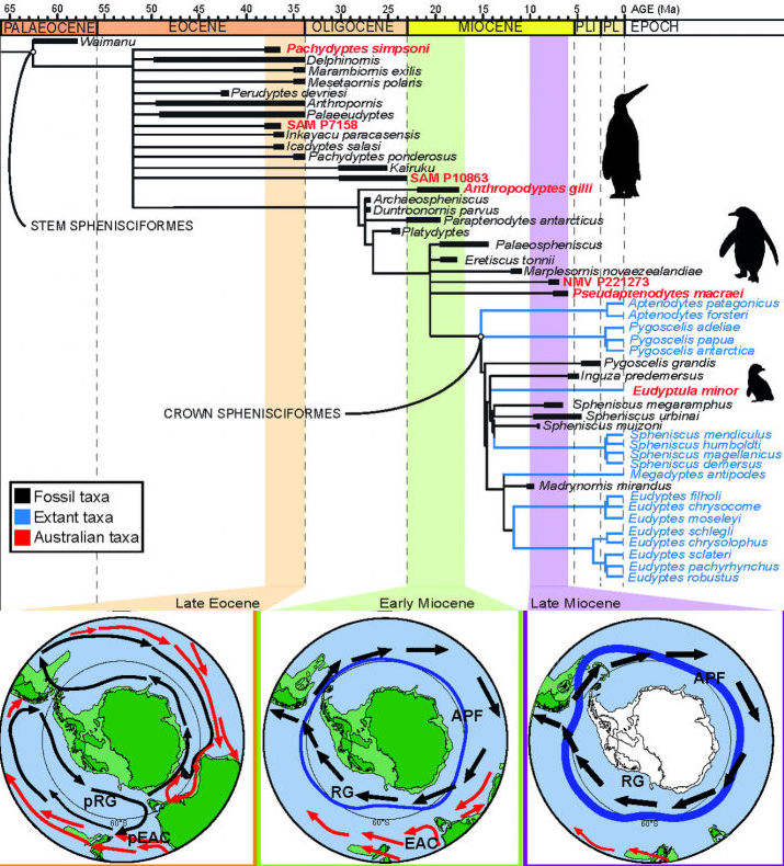 Les faits : L'ordre des Spheniciformes comprend deux groupes : le groupe basal, avec des espèces uniquement fossiles, disparaissant à l'Oligocène et au Miocène; et le groupe couronne, correspondant à la famille des Sphenicideae, avec quelques espèces fossiles mais surtout les 19 espèces connues vivant actuellement. Les Manchots du groupe basal étaient plus grands que les actuels (moyenne de 90 cm de haut - dont une espèce à 2 m, contre 60 cm en moyenne pour les actuels). Les Manchots sont des animaux aquatiques, ils se nourrissent dans les océans, abordant les côtes uniquement pour se reproduire. Les espèces se répartissent dans l'Antarctique et les régions sub-antarctiques, mais aussi dans des régions tempérées (Nouvelle Zéalande, Australie, Région du Cap, Chili jusqu'aux Galapagos. Dès l'Oligocène le passage de Drake commence à s'ouvrir entre la Terre de Feu et la Péninsule antarctique et à la fin du Miocène le continent antarctique se trouve complètement isolé. A l'isolement géographique s'ajoute un isolement climatique avec le courant circum-antarctique (flèches noires) et le front polaire antarctique (APF - trait bleu). Ainsi le continent antarctique va-t-il se couvrir de glace. L'interprétation : A priori le bouleversement climatique qui intervient pendant l'Oligocène et le Miocène pourrait être directement responsable de la disparition des espèces basales et de l'émergence des Sphénicideae. Cependant, dans ce cas, certaines espèces basales auraient sans doute survécu dans les régions tempérées et les Sphenicideae seraient plutôt cantonnées aux régions antarctiques et sub-antarctiques. Un autre scénario est plutôt retenu : dès l'Oligocène les eaux entourant l'Antarctique sont froides, donc riches en nutriments minéraux. Ainsi le plancton prolifère et une chaîne alimentaire bien fournie s'organise peu à peu sur cette ressource importante : d'abord le Krill (petite Crevette) qui constitue un maillon essentiel de cette chaîne; puis viennent plusieurs niveaux de prédateurs dont le plus élevé comprend les Phoques, Otaries, Dauphins et Orques. Les grands Manchots de l'Eocène et Oligocène n'ont plus leur place dans cette nouvelle organisation : - Ils se nourissent de gros poissons et sont donc en concurrence avec les autres prédateurs. - Peu agiles ils sont la proie des grands prédateurs. Les Sphenicideae, qui apparaissent au Miocène vont survivre pour la plupart car : - Leur régime alimentaire est surtout fait de Krill et de petits poissons, donc ils ne sont pas concurrencés par les autres prédateurs. - Plus rapides et plus agiles, ils échappent plus facilement à leurs prédateurs. |