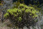 ici. Psiadia anchusifolia est un buisson de 2 à 4 m de haut. Les feuilles, sessiles, couvertes de poils, dentées, atteignent 20 cm de longueur. Les capitules sont groupés au sommet des tiges, leur diamètre est d'environ 1 cm, les bractées de l'involucre sont brun violacé et les fleurons, tous tubulaires, sont jaunâtres. Tribu : Astereae. |