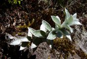ici. Psiadia argentea est un arbrisseau dont les tiges atteignent 50 cm de haut. Les feuilles, sessiles, presque aussi larges que longues, non dentées, de 1 à 2 cm de longueur, sont couvertes de poils longs et couchés sur les deux faces leur donnant un aspect argenté. Les capitules sont groupés en petit nombre au sommet des tiges, leur diamètre est d'environ 1 cm, les bractées de l'involucre sont verdâtres, les fleurons sont tous tubulaires et jaunâtres. Tribu : Astereae. |