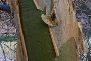 s'exfolie en lambeaux jaunes ou orangés, cependant l'écorce qui reste