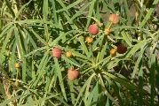 fleurs mâles et une fleur femelle. Le fruit est une capsule rouge, les