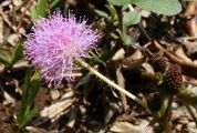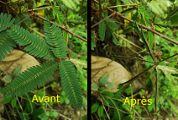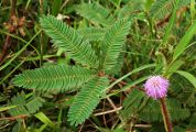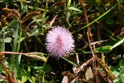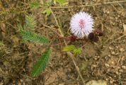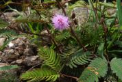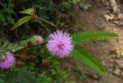 Nom vernaculaire : Sensitive Le genre Mimosa compte environ 500 espèces dont la majorité sont originaires des tropiques des Amériques. Ce sont des plantes herbacées ou des buissons, rarement des arbres ou des lianes. Beaucoup d'arbres sont appelés à tort Mimosas, ce sont en fait des Acacia. Le genre Mimosa est rangé dans la sous famille des Mimosoidae qui constitue, pour certains auteurs, une famille à part : Les Mimosaceae. Mimosa pudica se rencontre sous forme d'une plante rampante, couvrant le sol. Les feuilles ont un pétiole de 3 à 6 cm, 1 ou 2 paires de pennes divisées en une vingtaine de folioles de 1 cm au plus. L'inflorescence mesure environ 1 à 1,5 cm de diamètre. On trouve cette plante surtout dans les milieux perturbés. Ses feuilles se replient instantanément au moindre toucher, justifiant le nom vernaculaire (voir). |